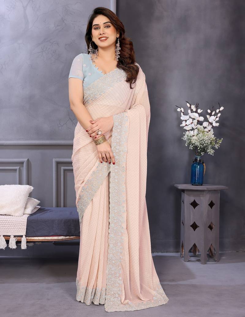 Peach Soft Georgette Embroidered Border Saree With Matching Blouse Piece