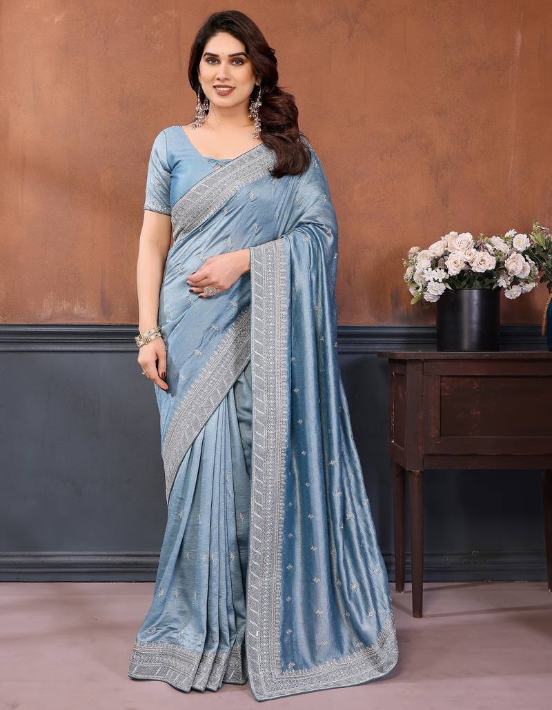 Sky Blue Vichitra Silk Saree Sequence Embroidered Saree With Matching Blouse Piece