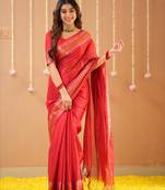 • Saree : Color- Blood Red / Fabric- Tissue • Blouse : Color- Red / Fabric- Tissue Saree Details