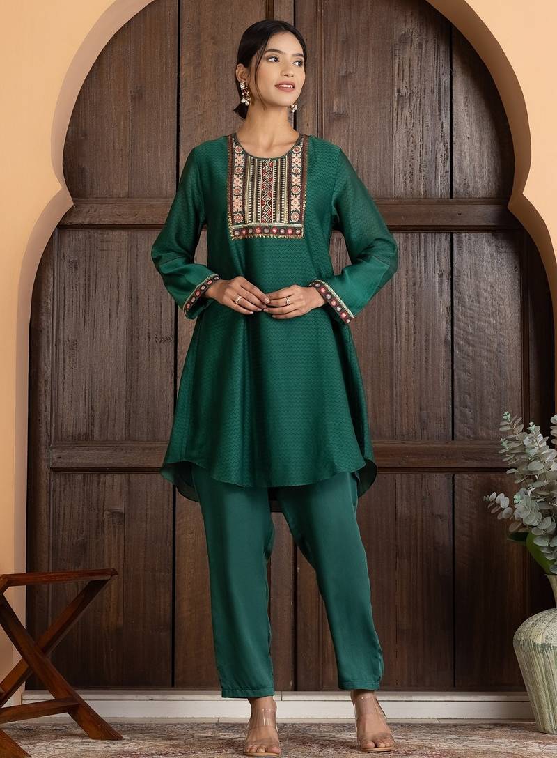 • Product Id : 4730316 • Package Details : 1 Top / 1 Bottom • Type : Long Kurti Designs • Work : Embroidered • Type : Geometric Print • Sleeve : Half Sleeve • Neck Style : Round Neck • Color : Green • Fabric : Chanderi Silk • Stitching : Stitched • Length : 45.0 Payments [+]