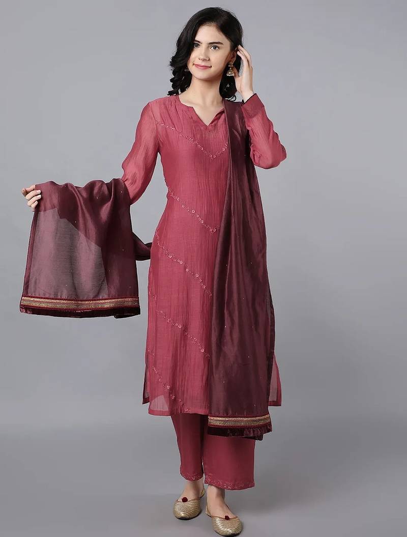 • Product Id : 4730330 • Package Details : 1 Top / 1 Bottom • Type : Long Kurti Designs • Work : Plain • Sleeve : Full Sleeve • Neck Style : V Neck • Color : Red • Fabric : Chanderi Silk • Stitching : Stitched • Length : 45.0 Payments [+]