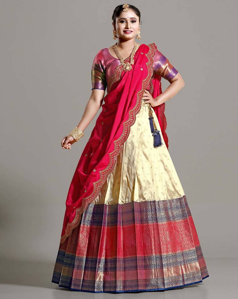The Blouse is designed to complement the Lehenga. It is tailored in a fitted style, made of brocade fabric. This Half Saree is completed with a contrasting Rangoli silk Dupatta which adds a graceful touch. The Dupatta is lightweight and sheer. Adorned with embroidered lace border.