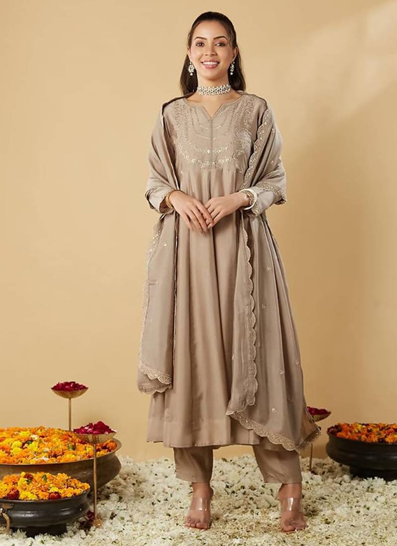 Beige Vichitra Silk Embroidered Anarkali Kurta Set Stitched