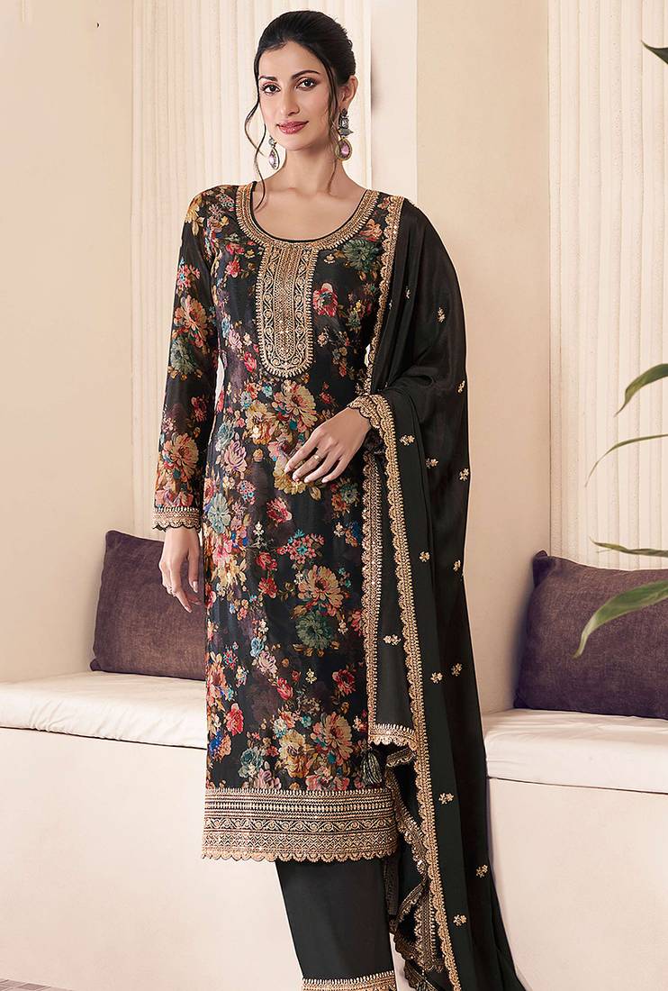 Black Chinon Silk Digital Print Salwar Suit Semi stitched
