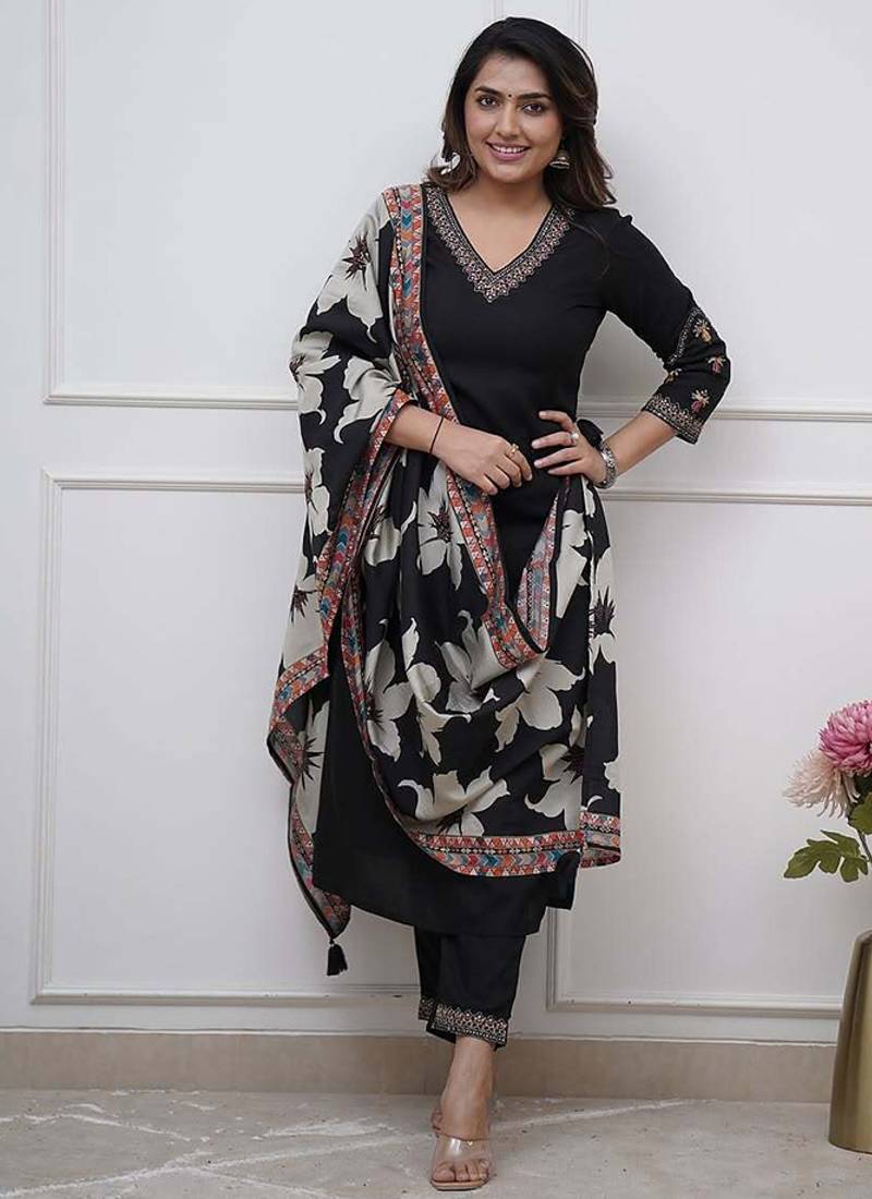 • Product Id : 4708990 • Package Details : 1 Top / 1 Bottom / 1 Dupatta • Type : Kurta Sets • Work : Embroidered • Type : Floral Print • Look : Designer • Sleeve : Quarter Sleeve • Neck Style : V Neck • Color : Black • Fabric : Silk Blend • Stitching : Stitched Payments [+]