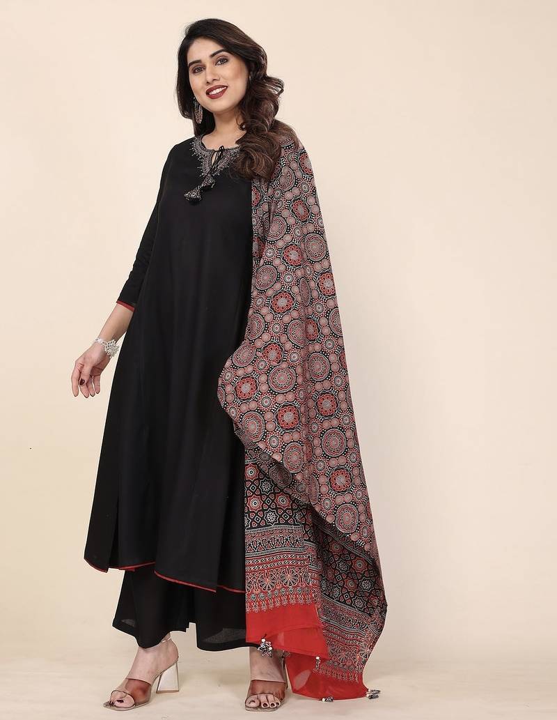 • Product Id : 4714792 • Package Details : 1 Top / 1 Bottom / 1 Dupatta • Type : Kurta Sets • Work : Plain • Type : Floral Print • Look : Designer • Sleeve : Quarter Sleeve • Neck Style : Round Neck • Fabric : Viscose • Color : Black • Stitching : Stitched Payments [+]