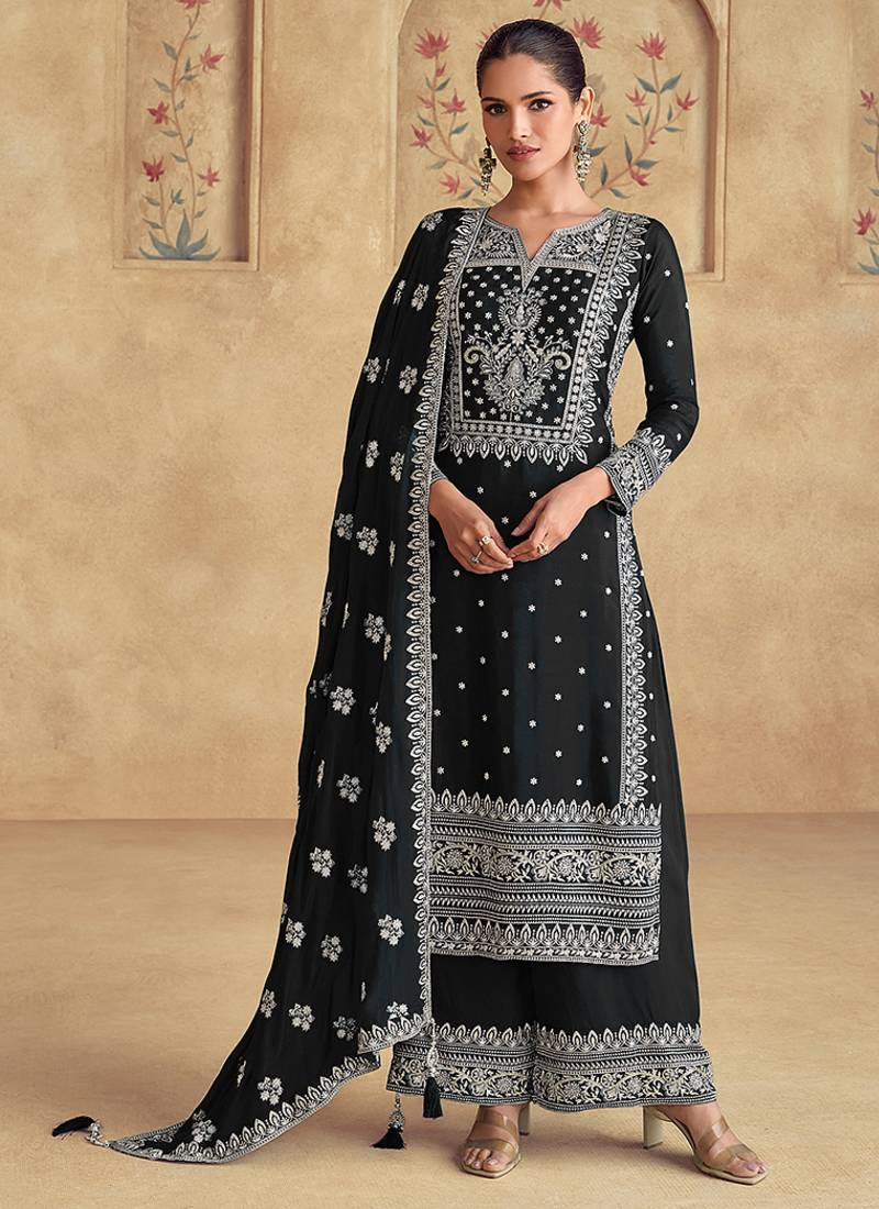 Black Georgette With Embroidered Palazzo Suit Semi stitched