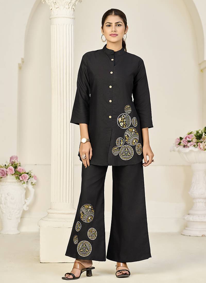 Black Rayon Slub Embroidered Co Ord Set Stitched
