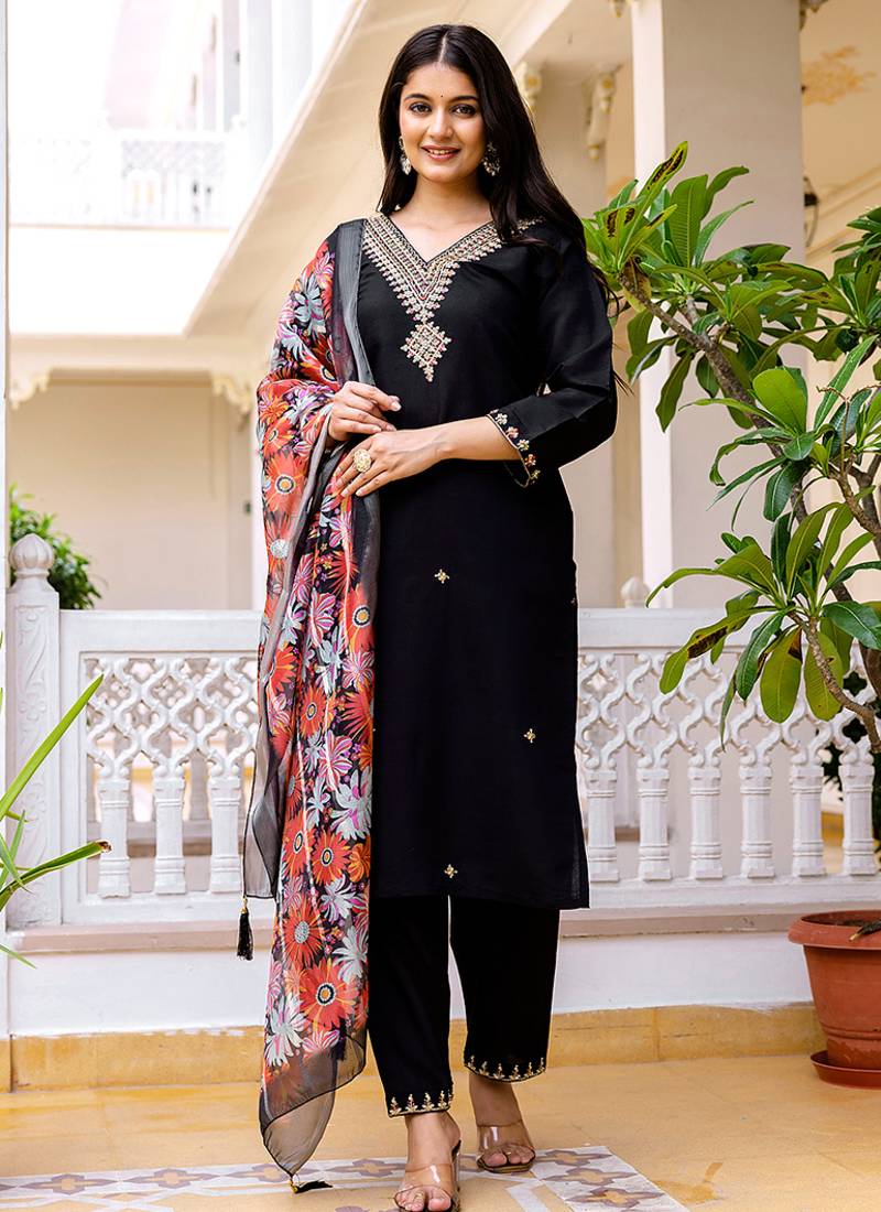 • Product Id : 4705965 • Package Details : 1 Top / 1 Bottom / 1 Dupatta • Type : Kurta Sets • Occasion : Ceremonial • Work : Embroidered • Type : Floral Print • Look : Designer • Sleeve : Quarter Sleeve • Neck Style : V Neck • Color : Black • Fabric : Faux Chanderi • Stitching : Stitched Payments [+]