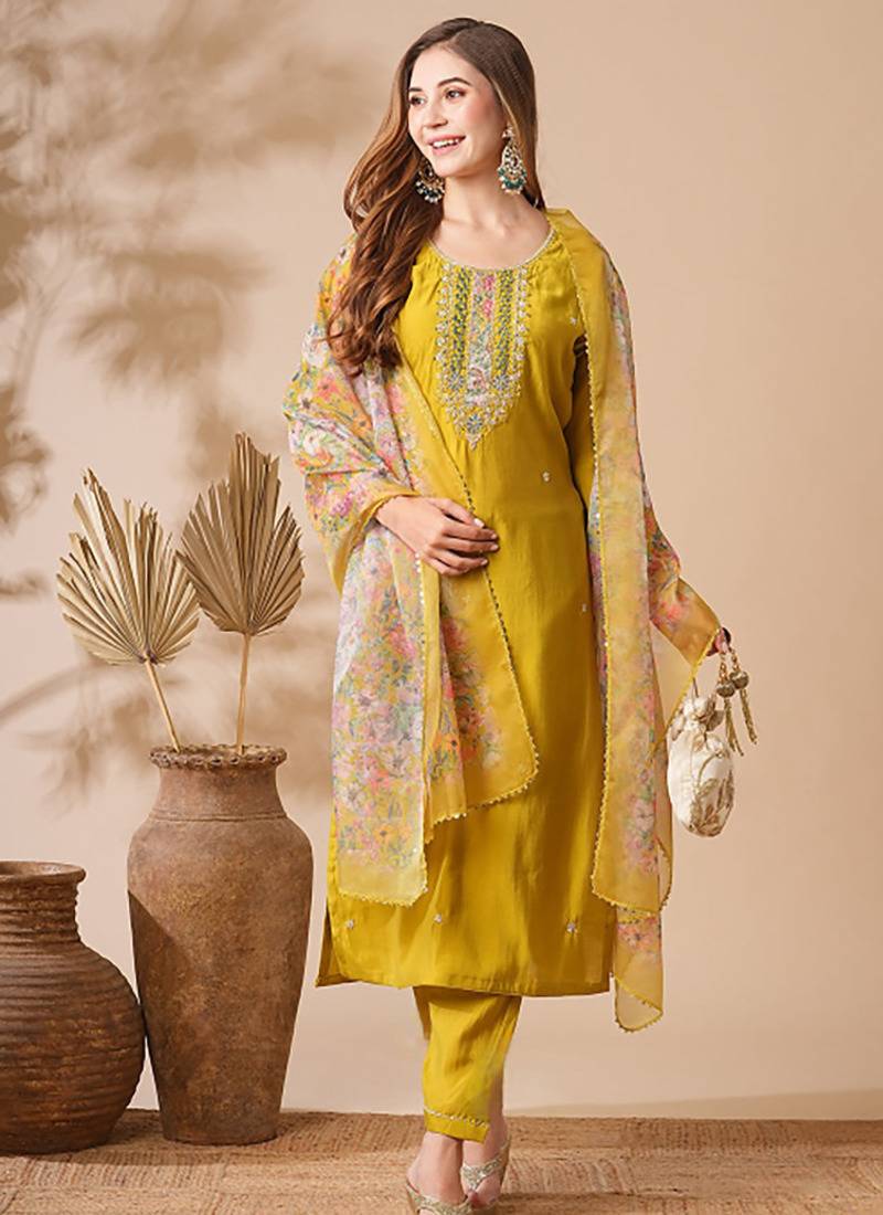 Chanderi Cotton Embrodiered Sttiched Suit In Mustard Stitched