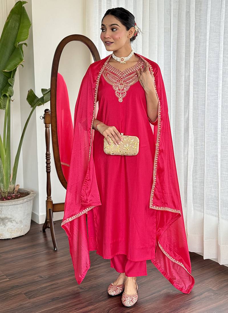 Chanderi Embroidered Kurta Set In Rani Pink Stitched