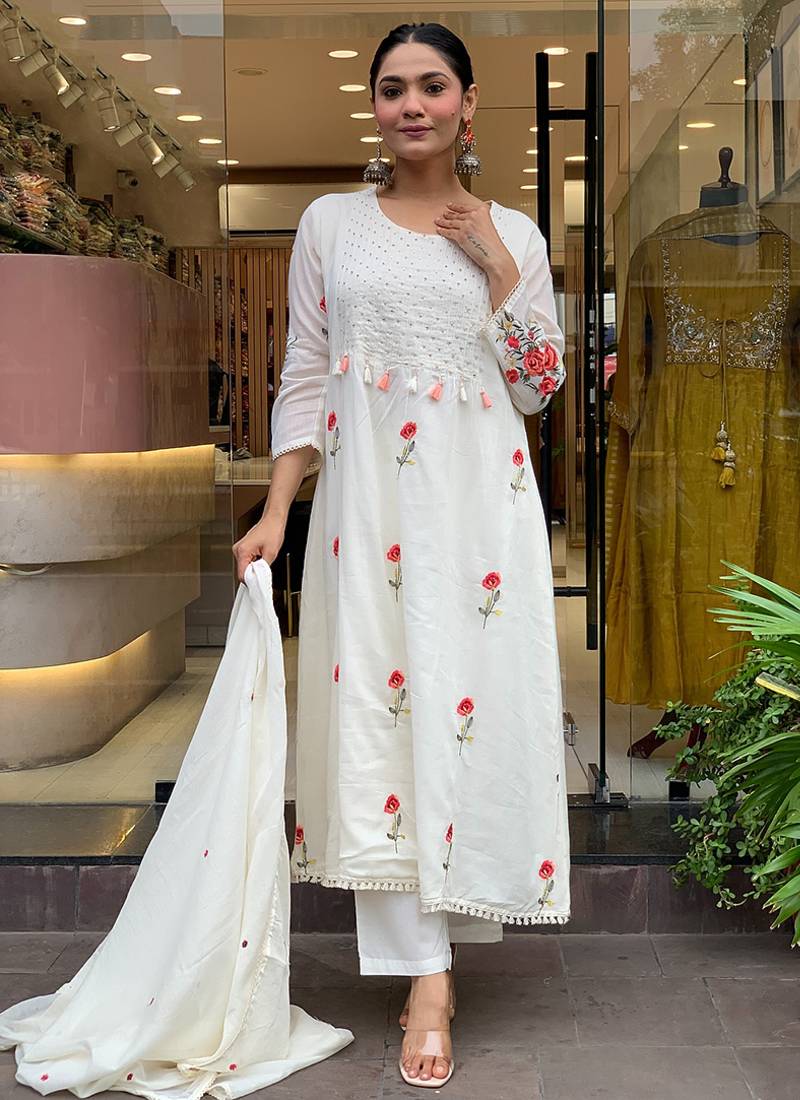 • Product Id : 4714767 • Package Details : 1 Top / 1 Bottom / 1 Dupatta • Type : Kurta Sets • Occasion : Ceremonial • Work : Embroidered • Type : Thread Work • Look : Designer • Sleeve : Quarter Sleeve • Neck Style : Round Neck • Color : White • Fabric : Faux Chanderi • Stitching : Stitched Payments [+]