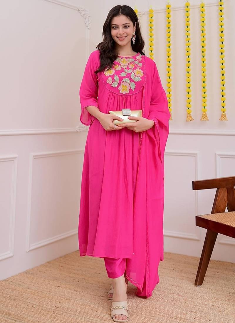 Chanderi Silk Hot Pink Embroidered Kurta Set Stitched