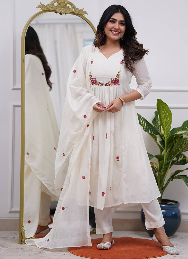 Chanderi Silk White Embroidered Salwar Suit Stitched