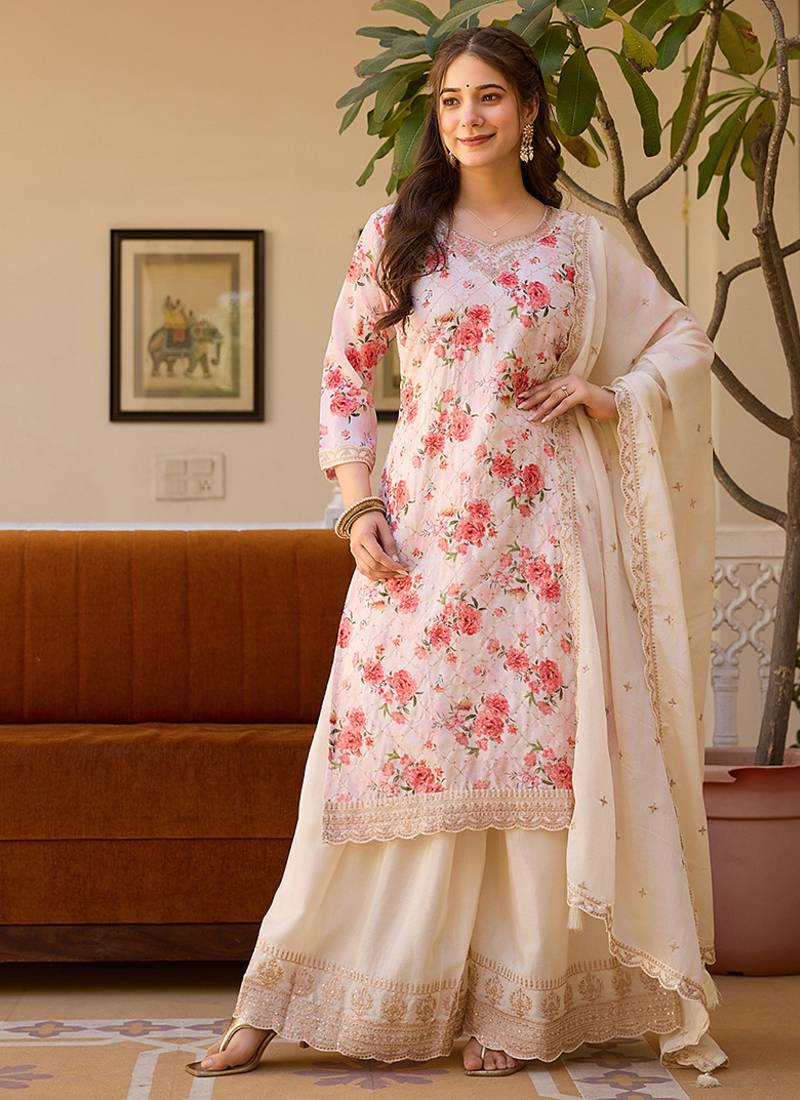 Made for movement, this Cream Color Chinon floral print suit carries embroidered with a subtle foil finish that shows nicely in pictures. The flare stays fluid so you can mingle comfortably through the evening. You feel poised and ready for festive wear.