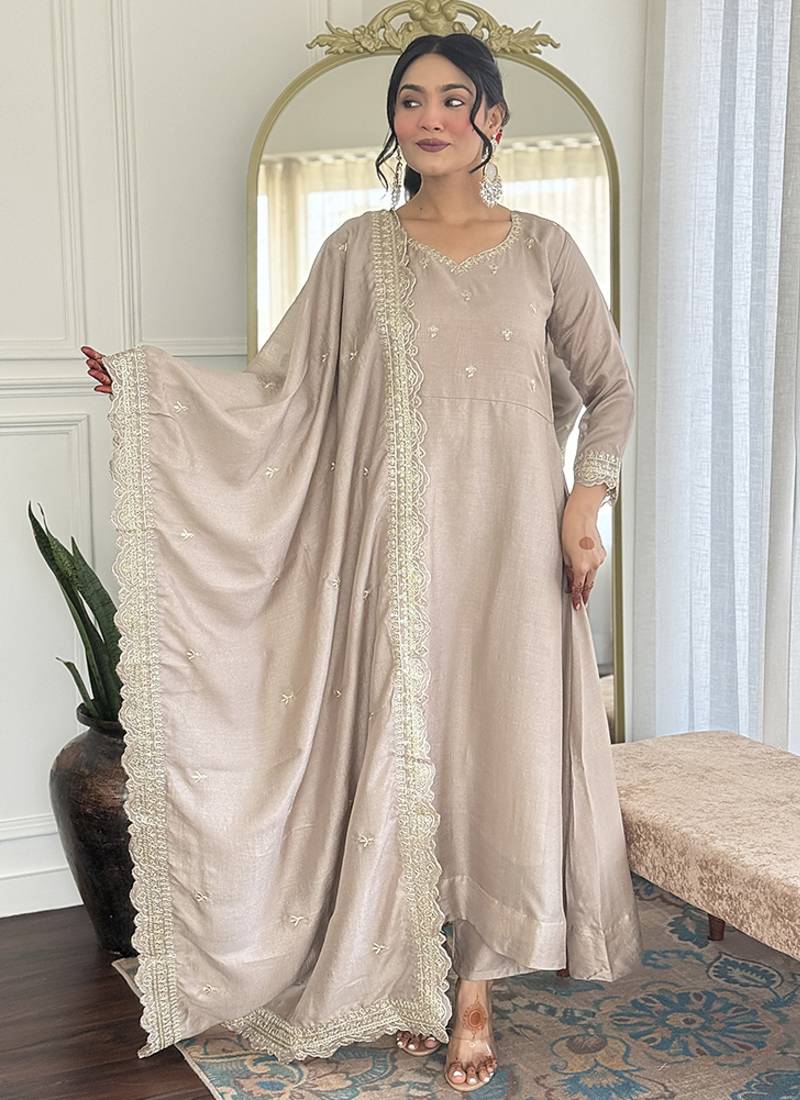 Cream Color Vichitra Silk Anarkali Suit Stitched