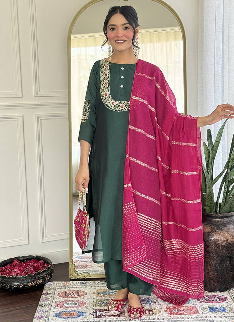 • Product Id : 4708991 • Package Details : 1 Top / 1 Bottom / 1 Dupatta • Type : Kurta Sets • Work : Embroidered • Type : Zari Woven • Look : Designer • Sleeve : Quarter Sleeve • Neck Style : Round Neck • Color : Dark Green • Fabric : Silk Blend • Stitching : Stitched Payments [+]