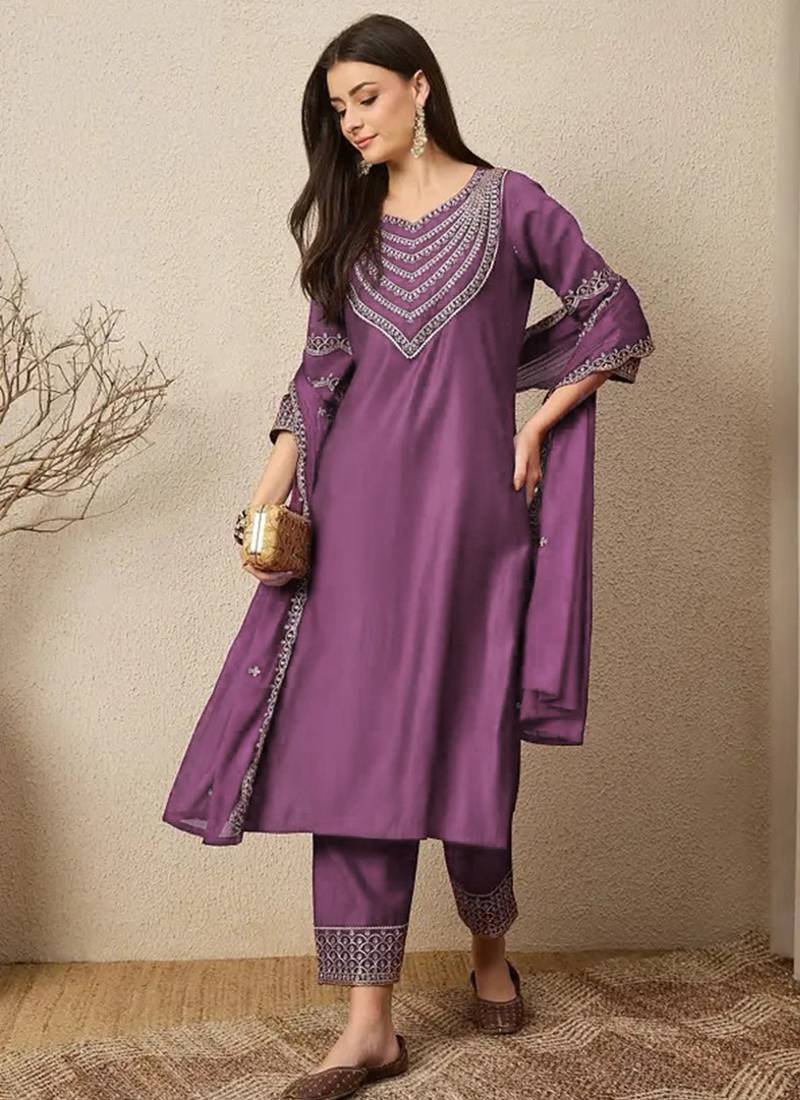 Dark Lilac Roman Silk Embroidered Suit Stitched