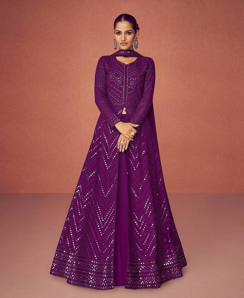 • Style : Sharara • Color : Dark Purple • Fabric : Faux Georgette Dupatta Details