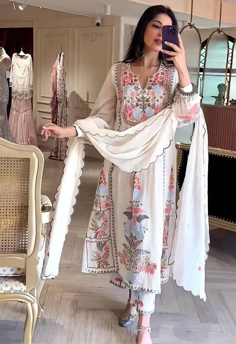 Embroidered Anarkali Georgette Suit In Off White Stitched