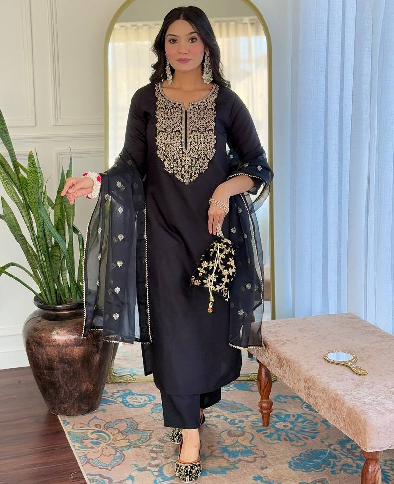 Embroidered Black Viscose Readymade Salwar Kameez Stitched