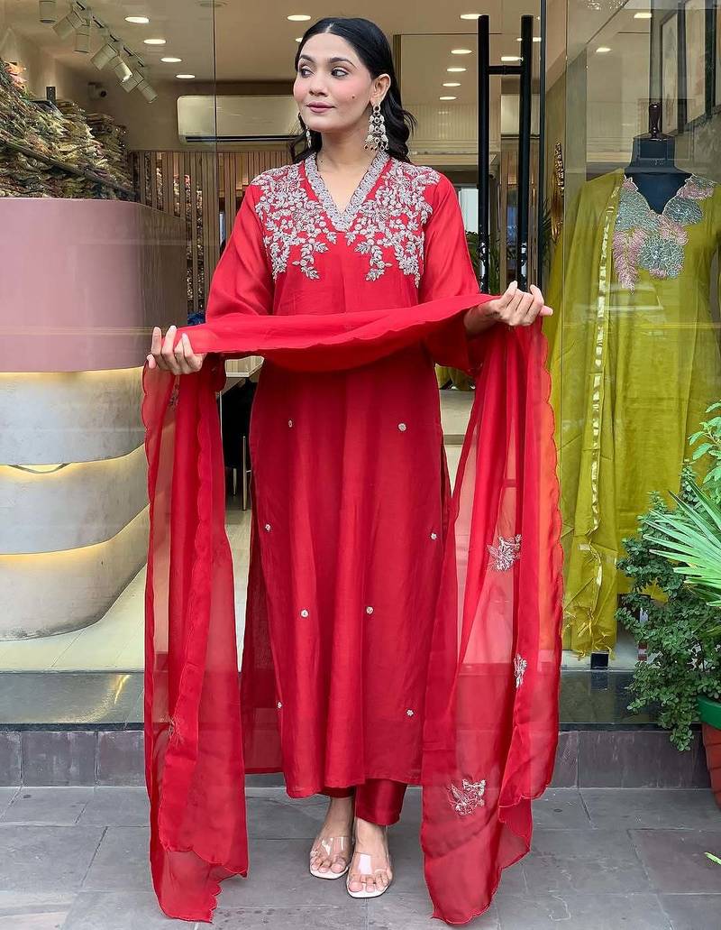 • Product Id : 4694514 • Package Details : 1 Top / 1 Bottom / 1 Dupatta • Type : Kurta Sets • Work : Embroidered • Type : Zari Work • Look : Designer • Sleeve : Elbow Sleeve • Neck Style : V Neck • Fabric : Chanderi • Color : Red • Stitching : Stitched Payments [+]
