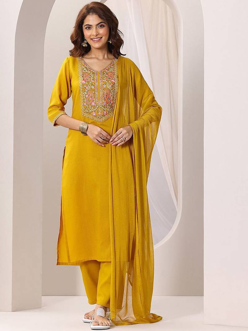• Product Id : 4694974 • Package Details : 1 Top / 1 Bottom / 1 Dupatta • Type : Kurta Sets • Work : Embroidered • Type : Floral Print • Look : Designer • Sleeve : Elbow Sleeve • Neck Style : V Neck • Fabric : Rayon • Color : Mustard • Stitching : Stitched Payments [+]