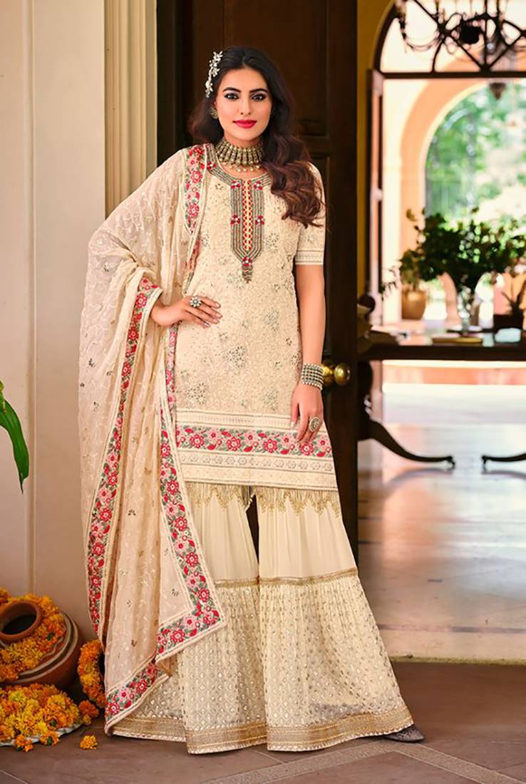 • Color : Cream • Fabric : Faux Georgette • Style : Palazzo Dupatta Details