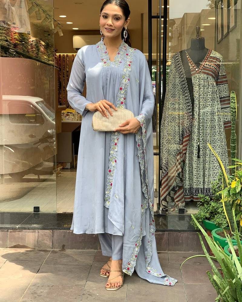 A festive Grey color Viscose Chinon suit featuring swaroski work and embroidery. Styled with quarter sleeves, keyhole neckline and a drawstring closure, dupatta ”ideal for pooja and festive occasions