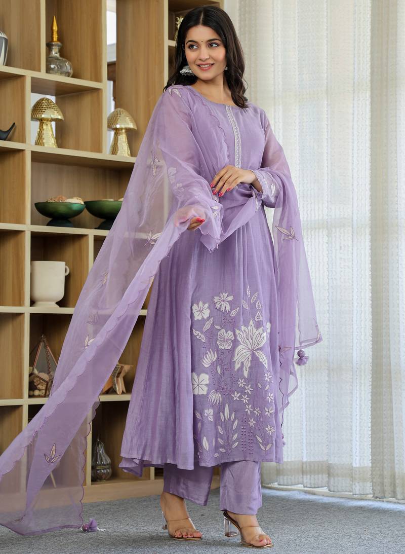 Lavender Chanderi Silk Embroidered Salwar Kameez Stitched