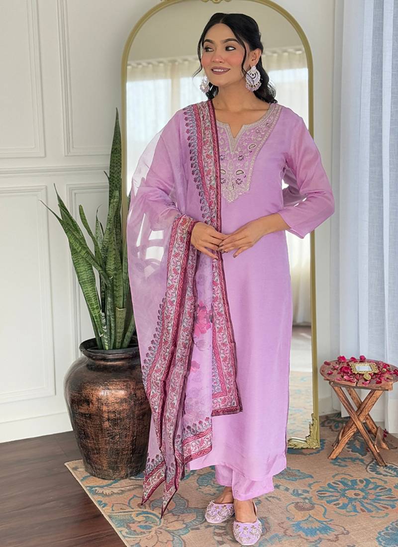 Add A Small Burst Of Shade To Your Wardrobe With This Lavender Silk Salwar Suit. The Embroidered Work Appears To Be Chic And Great For Engagement, Festival, Party And Reception. Comes With Matching rayon Bottom And tabby Dupatta. (Slight Variation In Color, Fabric & Work Is Possible. Model Images Are Only Representative.)