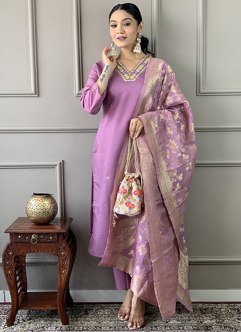 • Product Id : 4701081 • Package Details : 1 Top / 1 Bottom / 1 Dupatta • Type : Kurta Sets • Work : Embroidered • Type : Floral Print • Look : Designer • Sleeve : Elbow Sleeve • Neck Style : V Neck • Color : Lavender • Fabric : Faux Chanderi • Stitching : Stitched Payments [+]
