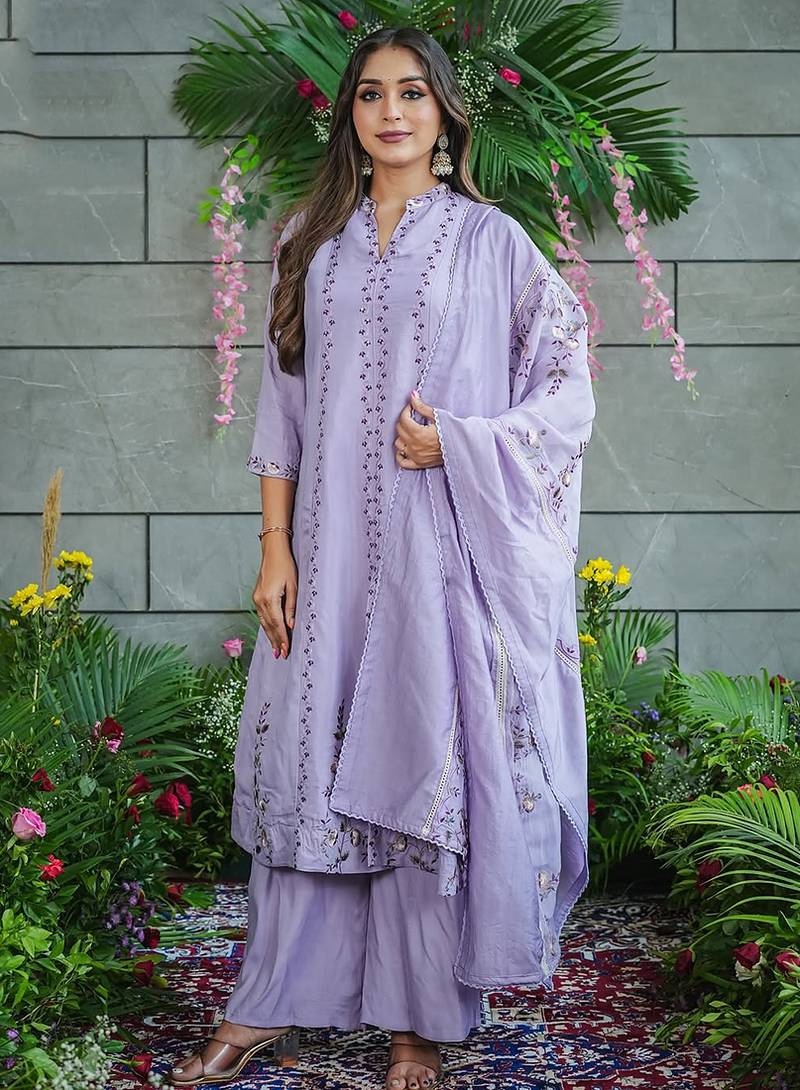 Be your diverse vogue diva with this lavender muslin cotton salwar suit. The ethnic embroidered work with a clothing adds a sign of attractiveness statement to your look. Comes with matching bottom and dupatta. (Slight variation in color, fabric & work is possible. Model images are only representative.)