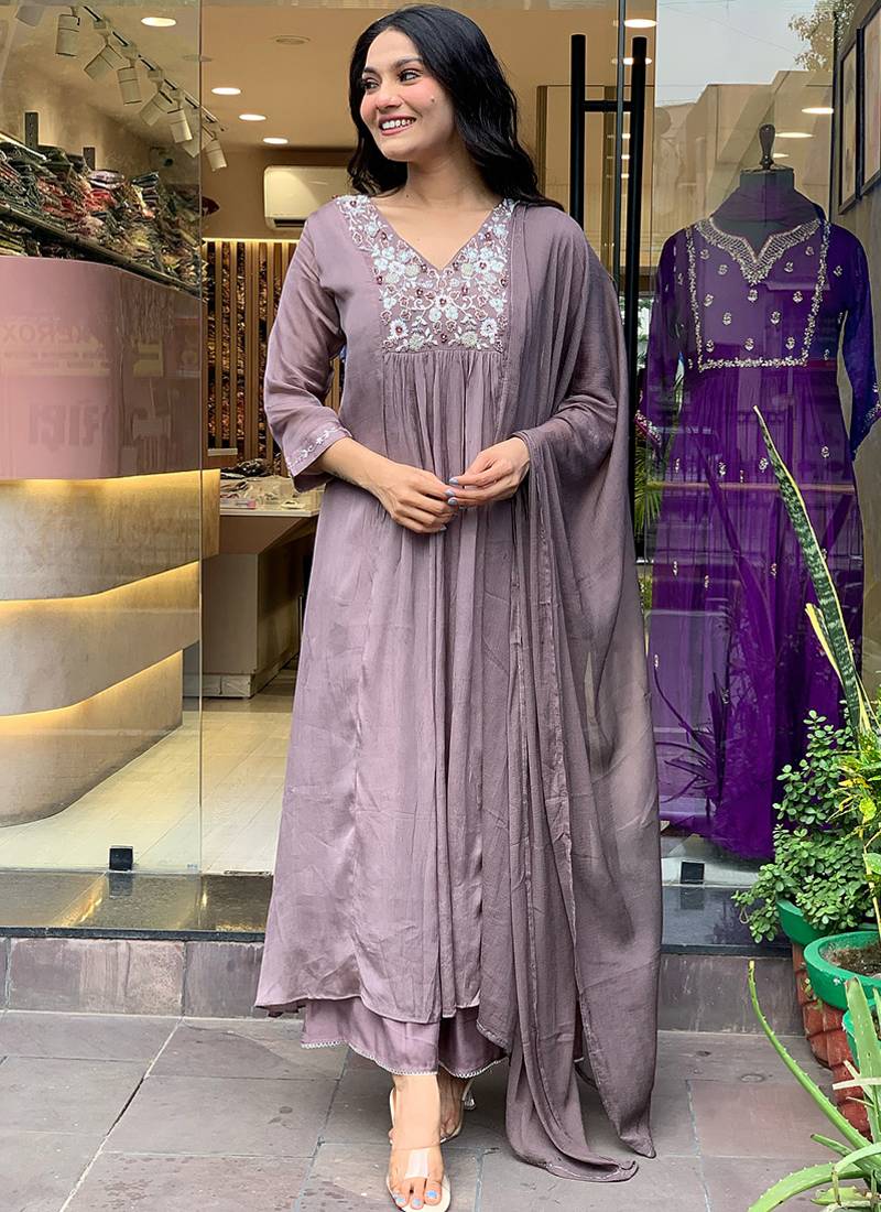 Lavender Viscose Chinon Embroidered Kurta Set Stitched