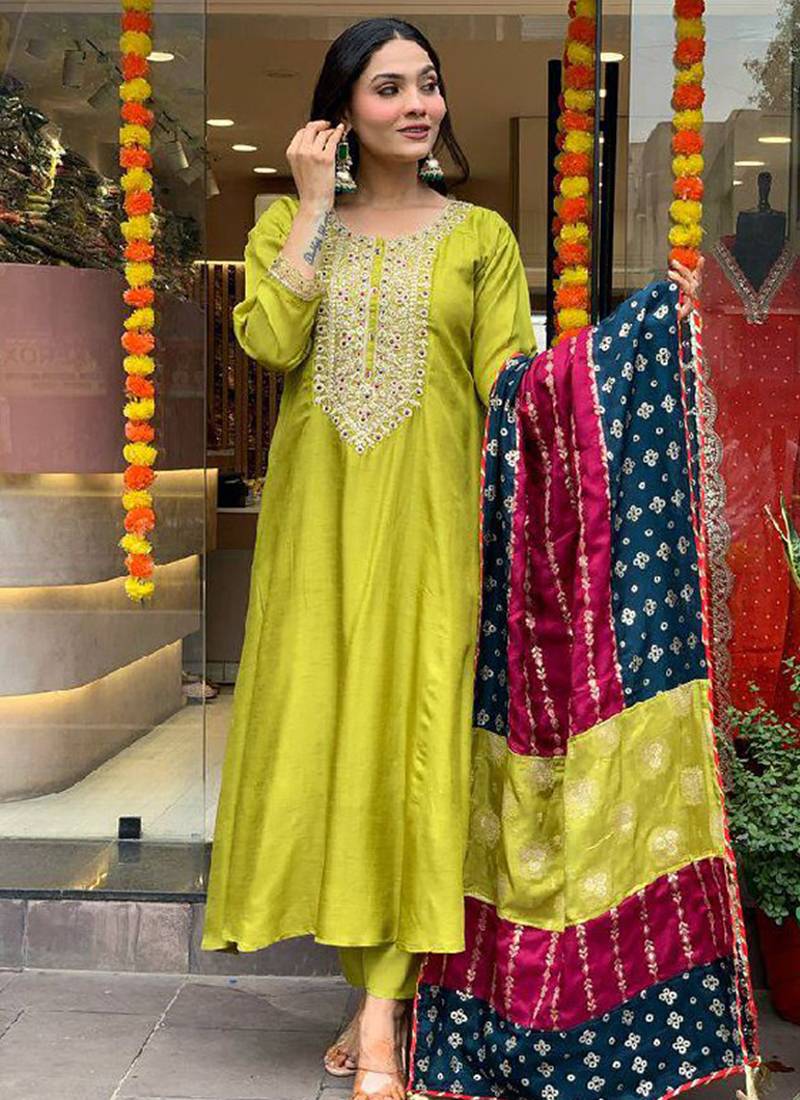 Lemon Green Color Vichose Chanderi Embroidered Anarkali Suit Stitched