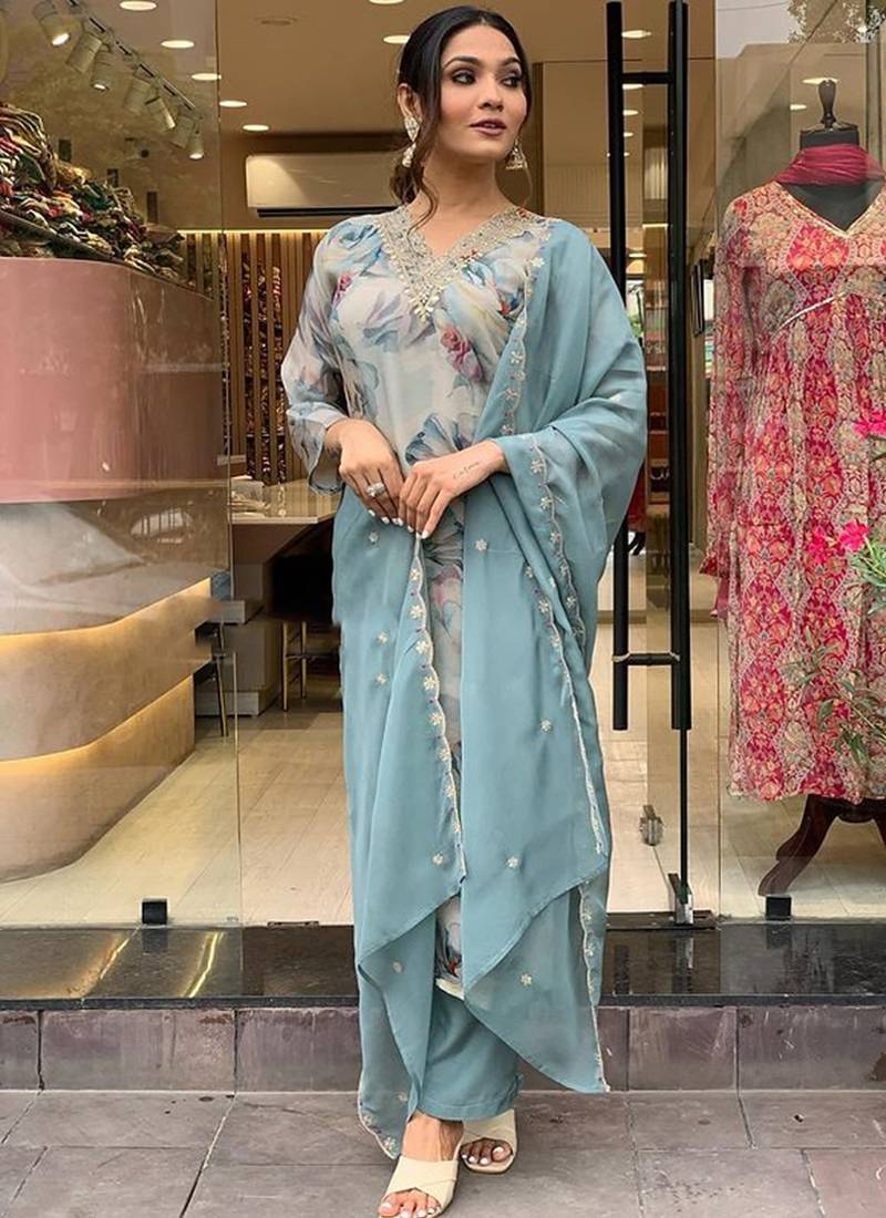 • Product Id : 4699263 • Package Details : 1 Top / 1 Bottom / 1 Dupatta • Type : Kurta Sets • Work : Embroidered • Type : Floral Print • Look : Designer • Sleeve : Elbow Sleeve • Neck Style : V Neck • Fabric : Organza • Color : Light Blue • Stitching : Stitched Payments [+]