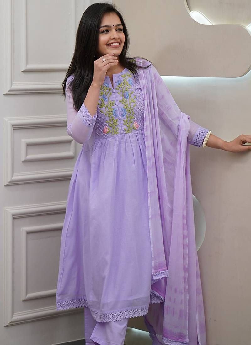 Made for movement, this light mauve color georgette anarkali suit carries embroidered with a subtle foil finish that shows nicely in pictures. The flare stays fluid so you can mingle comfortably through the evening. You feel poised and ready for festive wear.