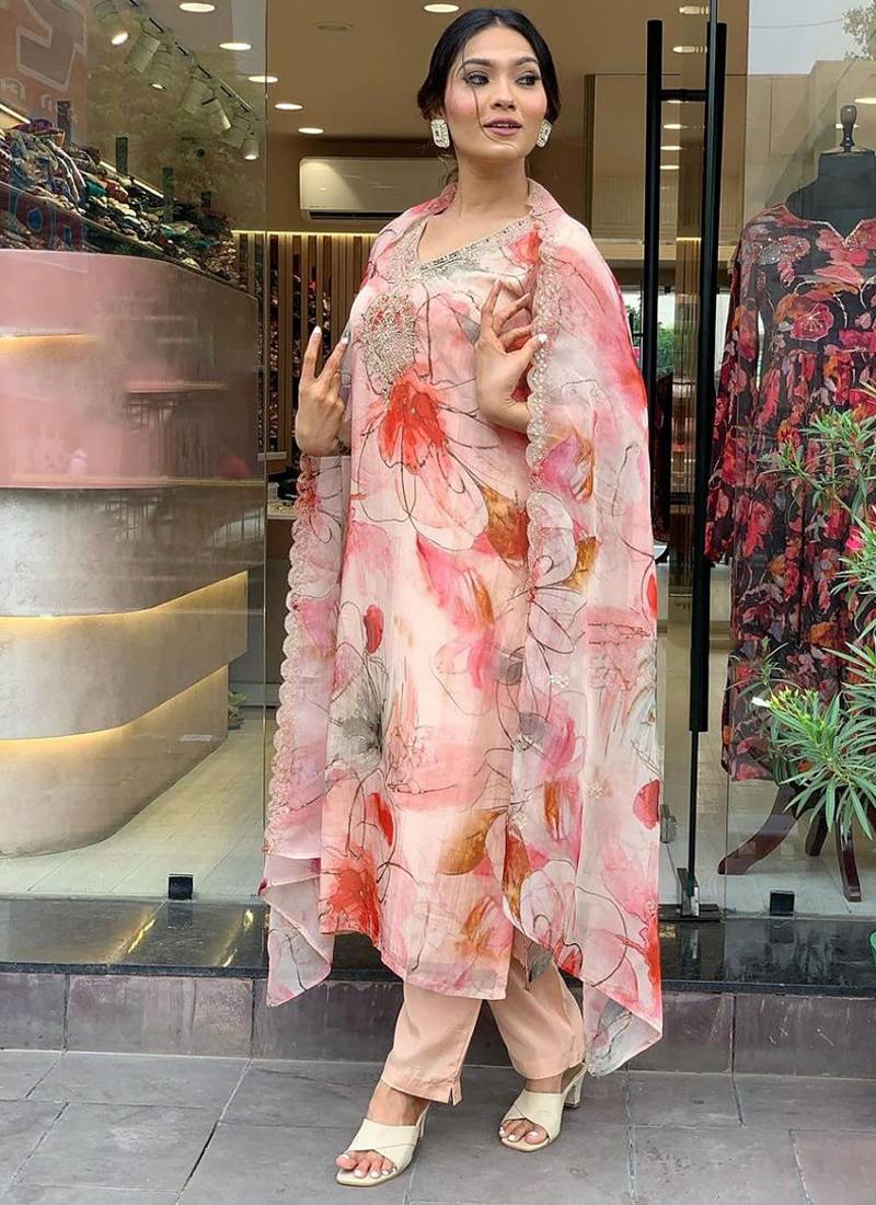 Light Pink Color Organza Digital Print Readymade Style Suit Stitched