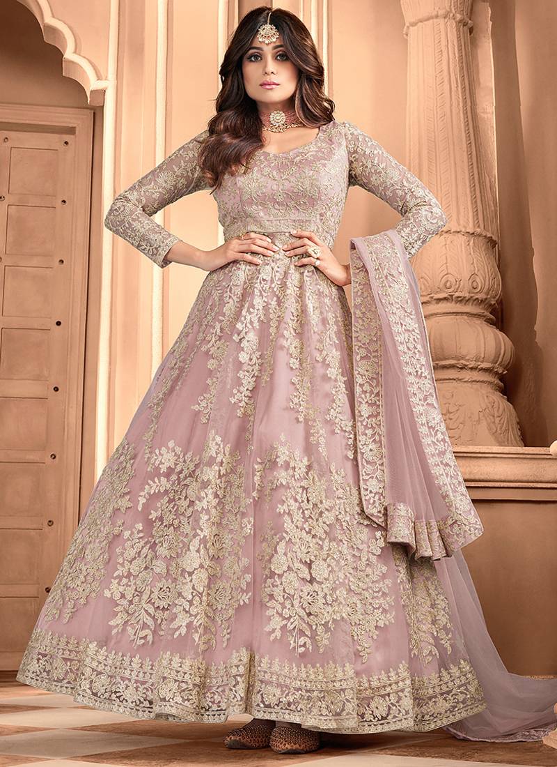 Light Pink Net With Embroidered Work Anarkali Suit Semi stitched