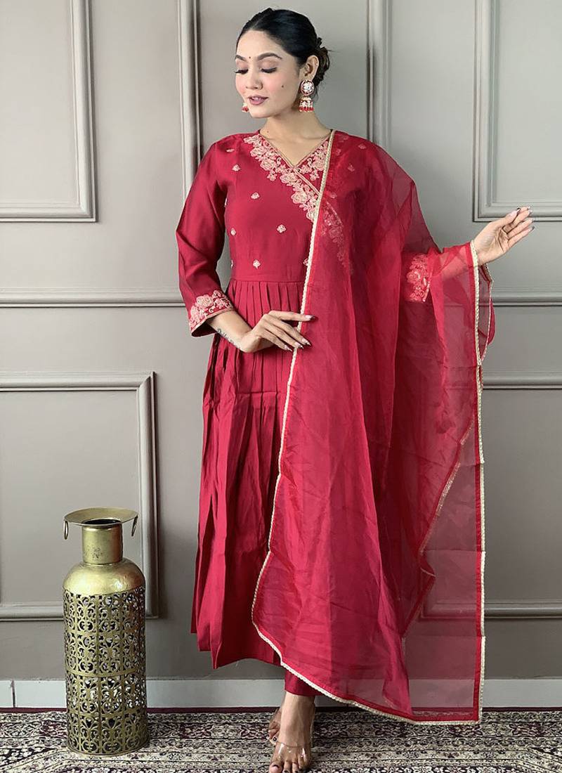 Maroon Viscose Chanderi Anarkali Sttiched Suit Stitched