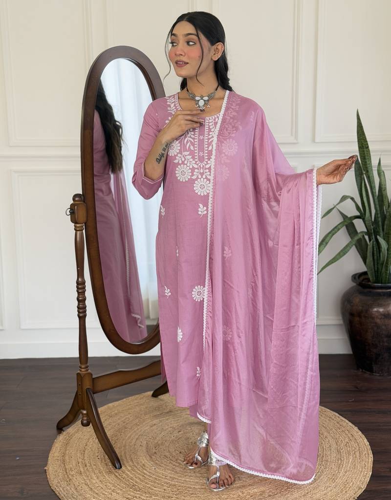 • Kameez : Color- Mauve • Dupatta : Color- Mauve / Fabric- Chanderi • Bottom : Color- Mauve / Fabric- Blended Cotton Kameez Details