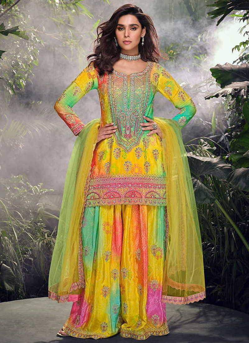 A festive Multicolor chinon silk straight featuring cut dana and embroidery. Styled with 3/4th sleeves, keyhole neckline and a drawstring closure, paired with straight palazzo and dupatta”ideal for pooja and festive occasions.Note :- This Suit will be Sttiched free size 42"