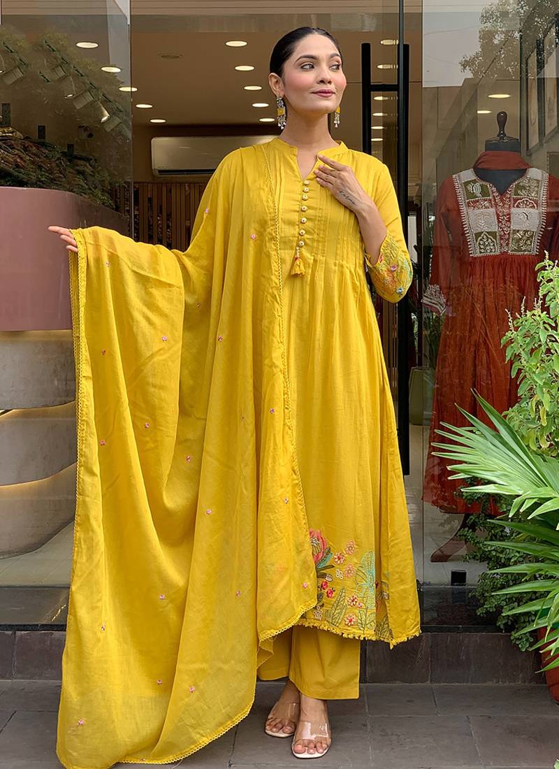 Mustard Chanderi Silk Embroidered Anarkali Suit Stitched