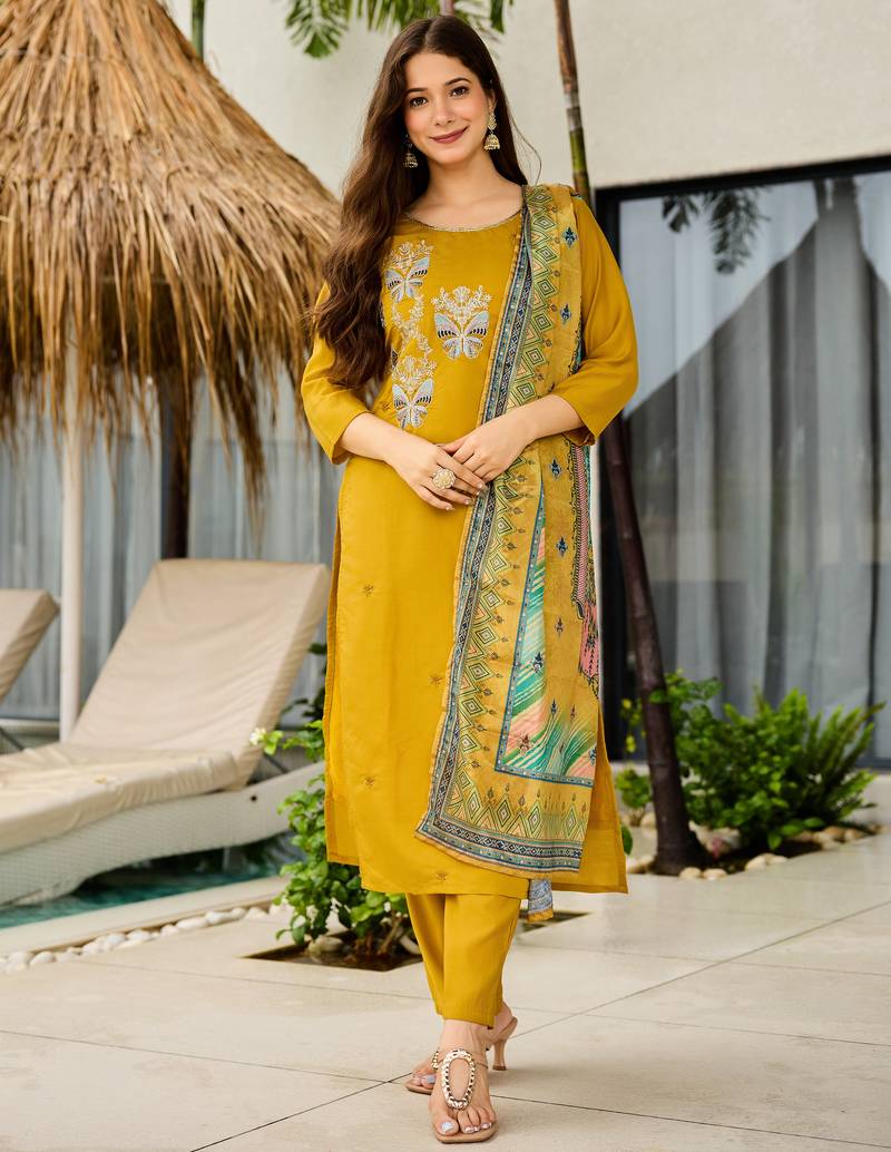 Mustard Embroidered Roman Silk Readymade Salwar Kameez Stitched