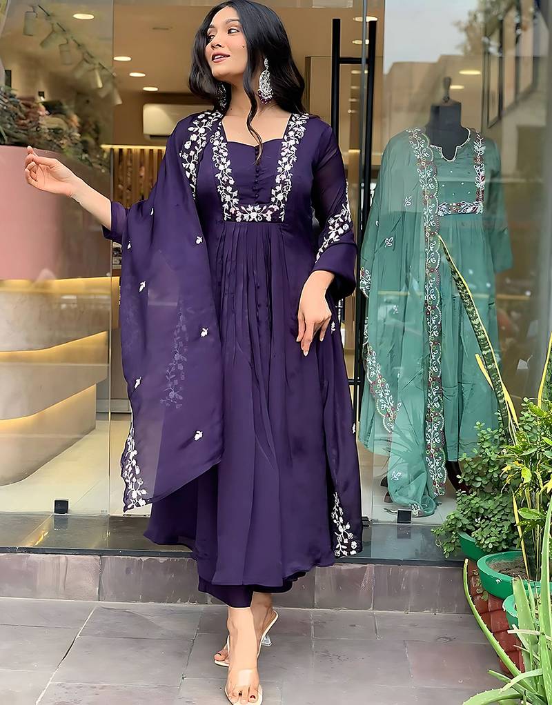 Navy Blue Color Embroidred Silk Anarkali Suit Stitched