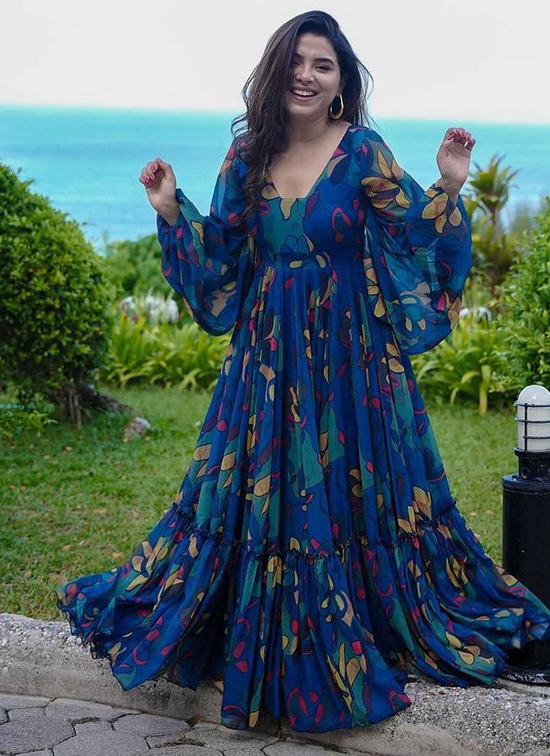 Navy Blue Color Floor Length Georgette Gown Stitched