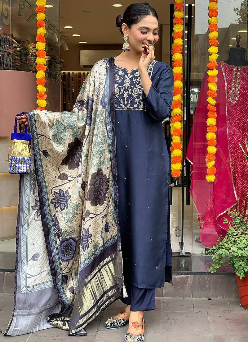 • Style : Salwar • Color : Navy Blue • Fabric : Faux Chanderi • Color : Navy Blue Dupatta Details