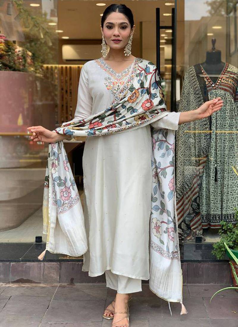 • Product Id : 4708917 • Package Details : 1 Top / 1 Bottom / 1 Dupatta • Type : Kurta Sets • Work : Embroidered • Type : Floral Print • Look : Designer • Sleeve : Elbow Sleeve • Neck Style : V Neck • Color : Off White • Fabric : Faux Chanderi • Stitching : Stitched Payments [+]