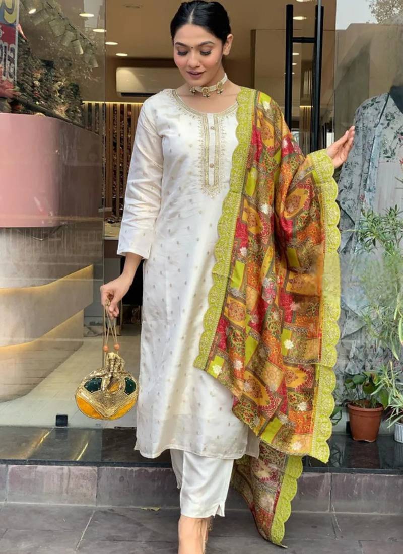 A vibrant off white straight jacquard butti kurta set with zardosi work, styled with an elasticated pant and natural crepe dupatta. A strong color-pop festive option with minimal .