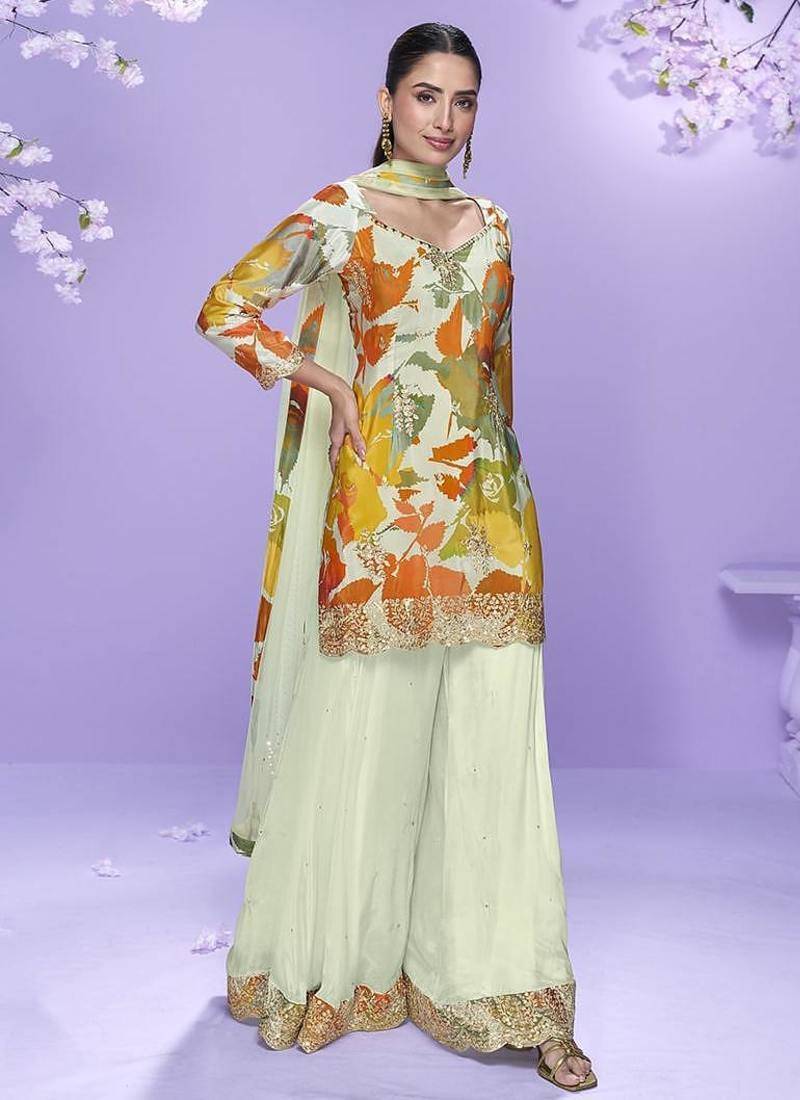 • Color : Off White • Fabric : Silk Blend • Style : Palazzo • Color : Off White Dupatta Details